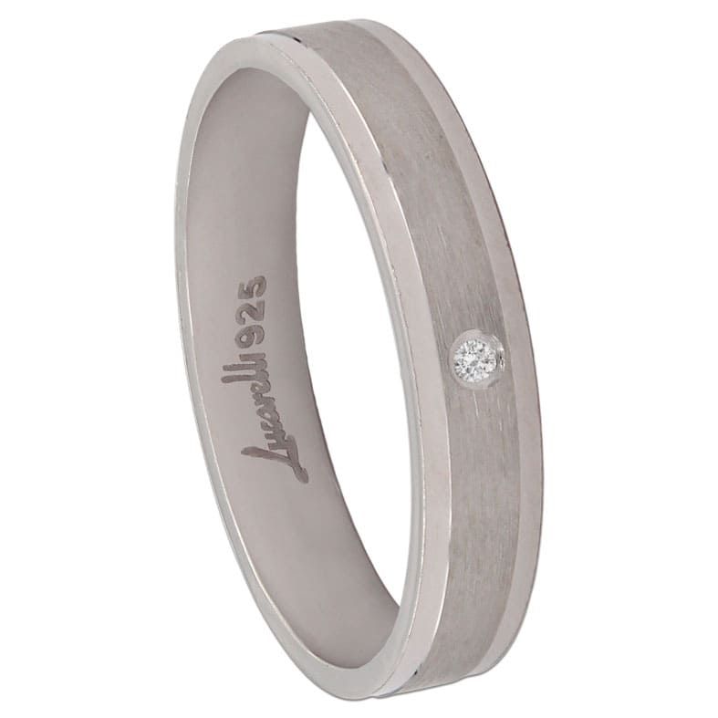 Alianza con circonitas, en plata de 1ªley con baño de rodio, con un ancho de 4 mm y un grosor de 1,58 mm, además su terminación es en brillo y mate.