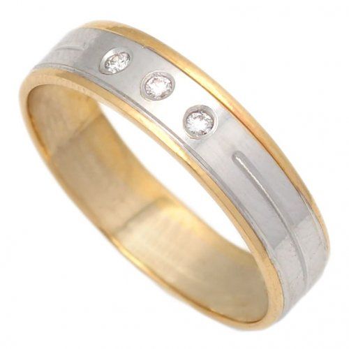Alianza tallada de oro de 18kts bicolor, que combina oro blanco y oro amarillo, con 3 diamantes engastados, de terminación en brillo y con un ancho de 5mm, disponibilidad de elección de talla para cada tamaño de dedo.