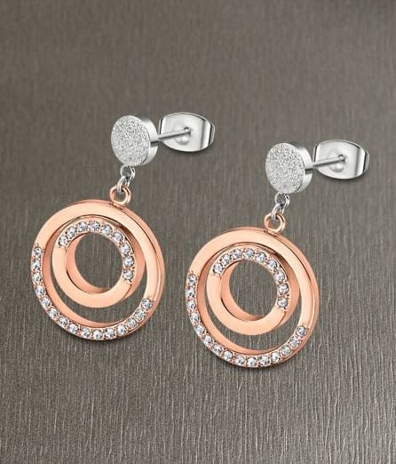 Colgante Redondo de Acero, chapado en oro rosa, calado con un círculo interno y circonitas engastadas, y medida de 21 mm de diámetro.