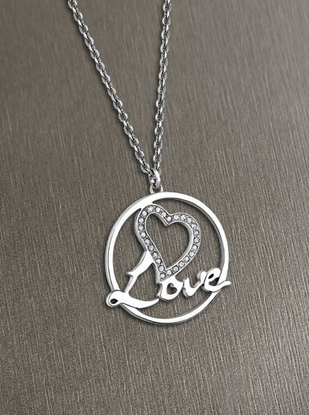 Gargantilla en Acero, con medalla calada, la palabra "Love" y circonitas engastadas.