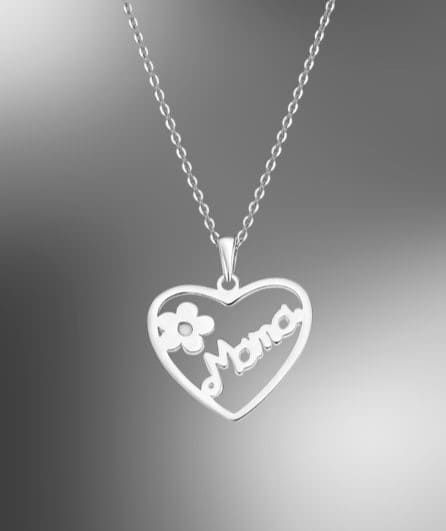 Calado en forma de corazón, con la palabra "Mamá" y adorno de flor.