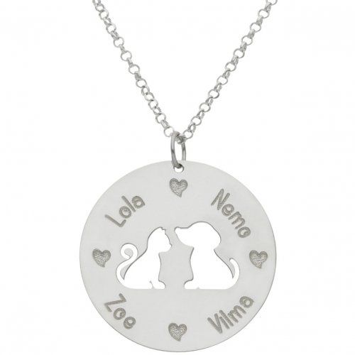 Con un perrito y un gatito calados dentro de una medalla.