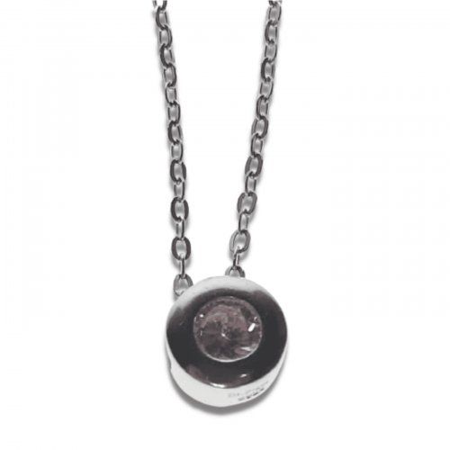 Con chatón circular de circonita en tono rosa, y además con un baño de rodio.