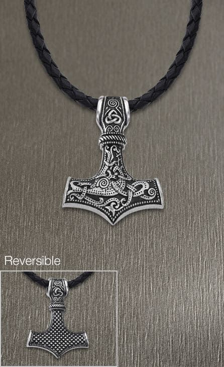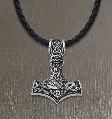 Lleva cadena de cuero trenzado negro, y el motivo central está tallado con símbolos célticos.