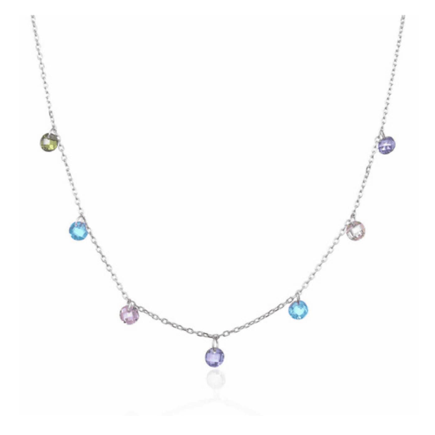 Con baño de rodio, y abalorios de circonitas de color colgando de una cadena de tipo forzada.