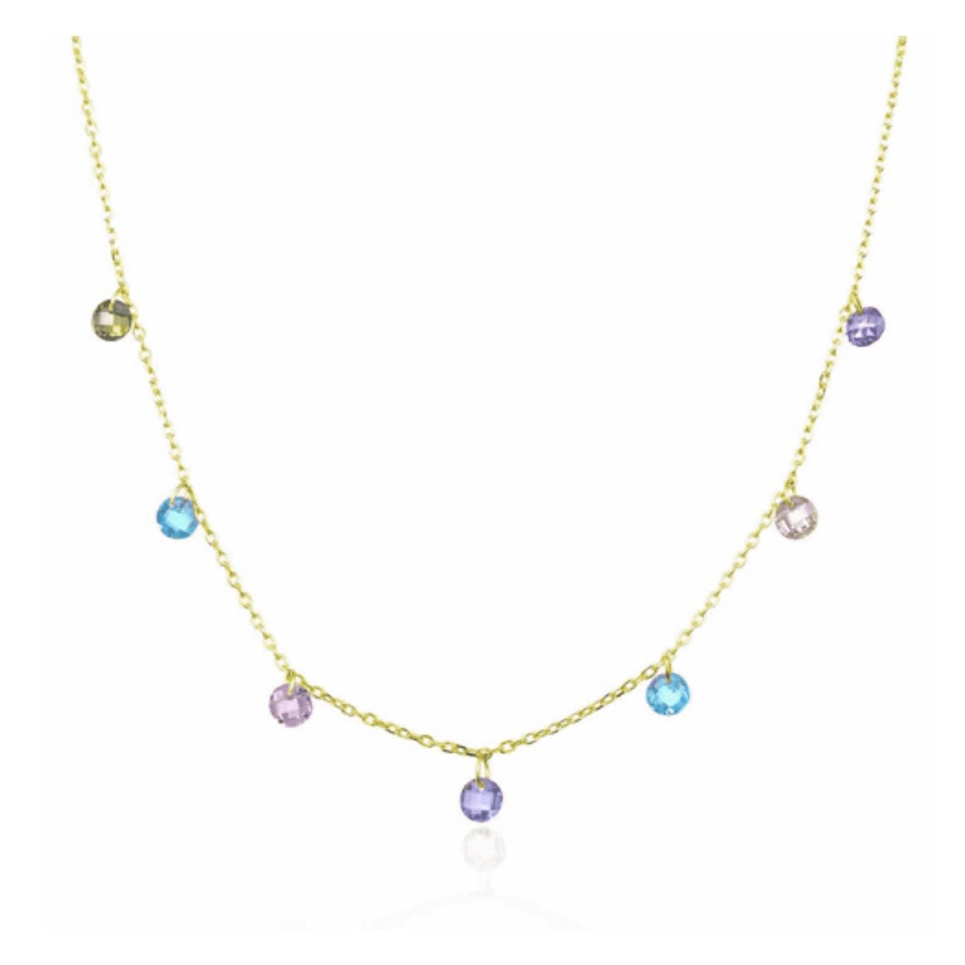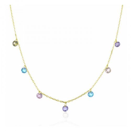 Con baño de oro, y abalorios de circonitas de color colgando de una cadena de tipo forzada.