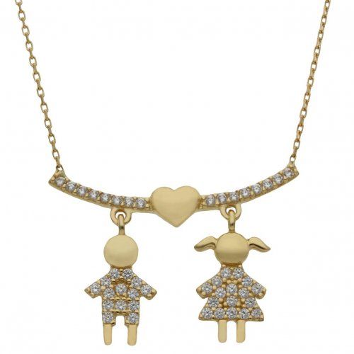Con circonitas engastadas y un corazoncito en el medio del colgante, además la cadena mide un largo total de 45 cm.