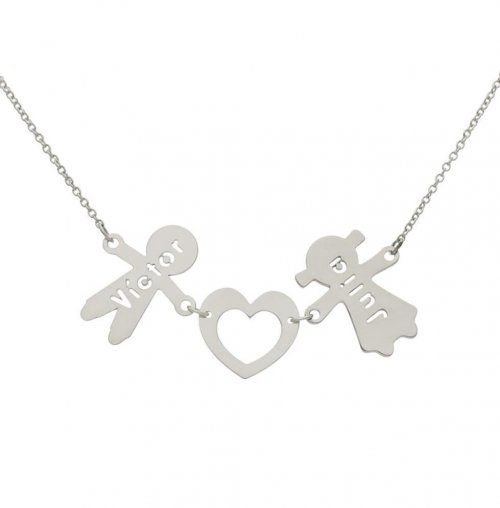 Con nombres en calado sobre colgantes en forma de niños; puede llevar hasta 6 niños.