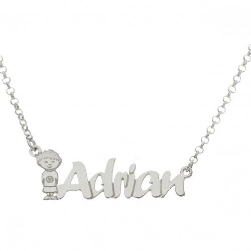 Con niño sujeto al nombre, rodinada con cadena tipo rolot diamantada con 1,50 mm de ancho y 45 cm de largo.