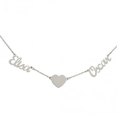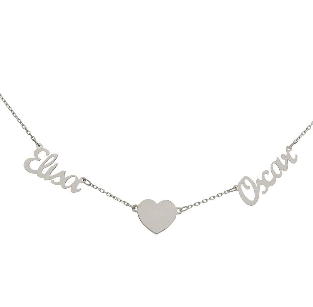 Gargantilla personalizada de 2 nombres con un corazón, en Oro Blanco de 1ªley, 18kts.