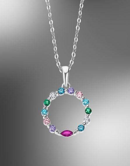 Con cerco de circonitas de color engastadas, cadena incluída de 45 cm de largo y baño de rodio.
