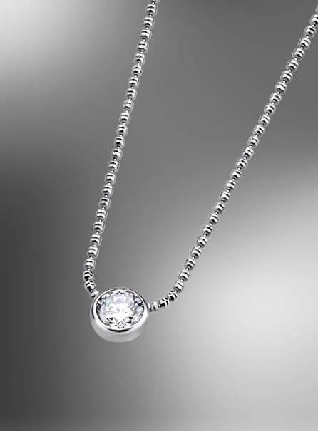 Con circonita de 6 mm de diámetro engastada en chatón, cadena de 45 cm de largo y baño de rodio.
