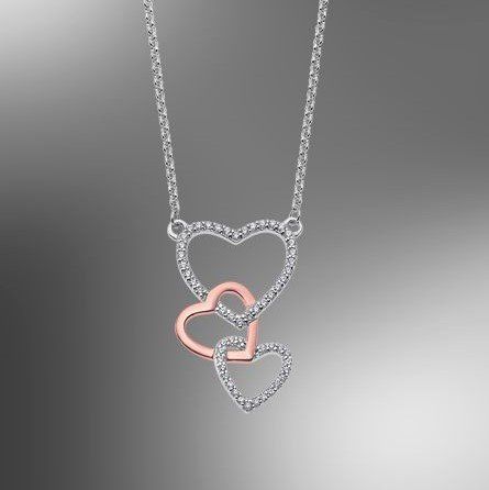 Con corazones enlazados, baño de oro rosa, circonitas engastadas y cadena de 45 cm de largo.