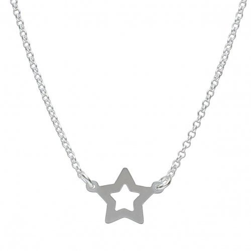 Con estrella calada enlazada a cadena tipo rolot con 2 mm de ancho y 48 cm de largo.