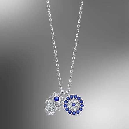 La "mano de Fátima", o también llamada "Jamsa" interpreta bendiciones, poder y fuerza. Además ofrece protección contra el mal de ojo y está visto como un amuleto protector. El pueblo árabe solía ponerla en las puertas de las casas para proteger los hogares y familias; también añadir que el cinco es el número considerado de la buena suerte en su cultura, puesto que los cinco dedos del Jamsa tienen el poder para proteger.