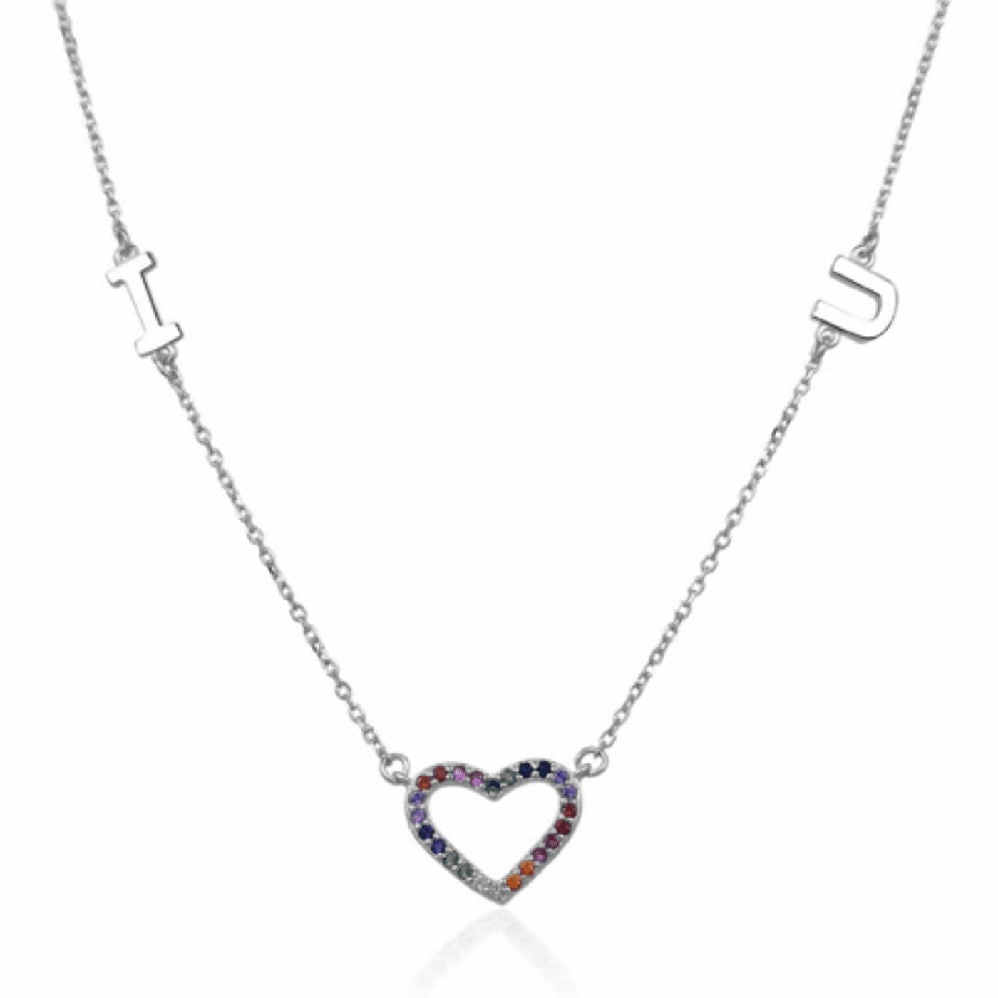Con baño de rodio, corazón de circonitas de color engastadas y letras "I" y "U" que forman un "I LOVE YOU".