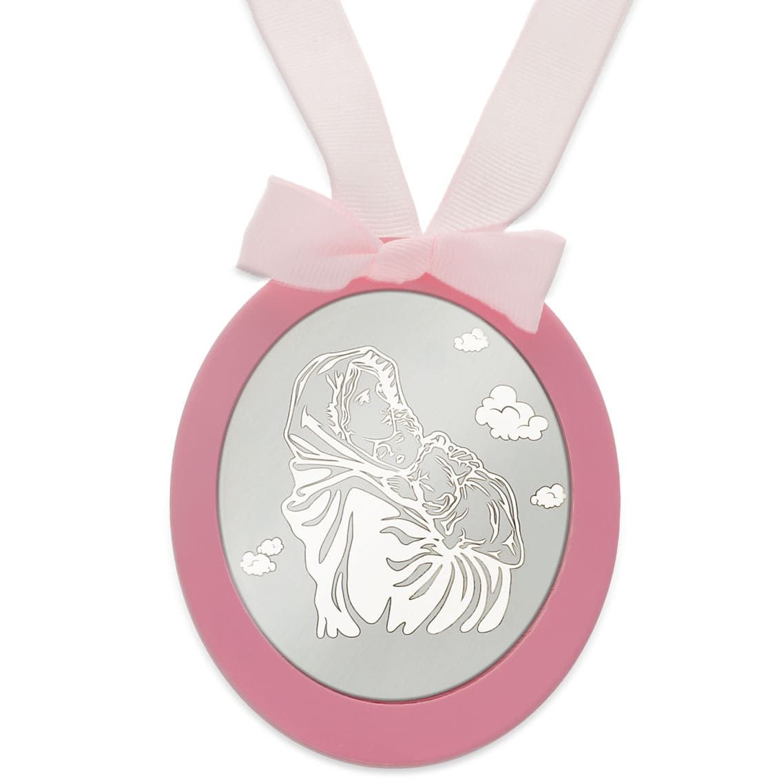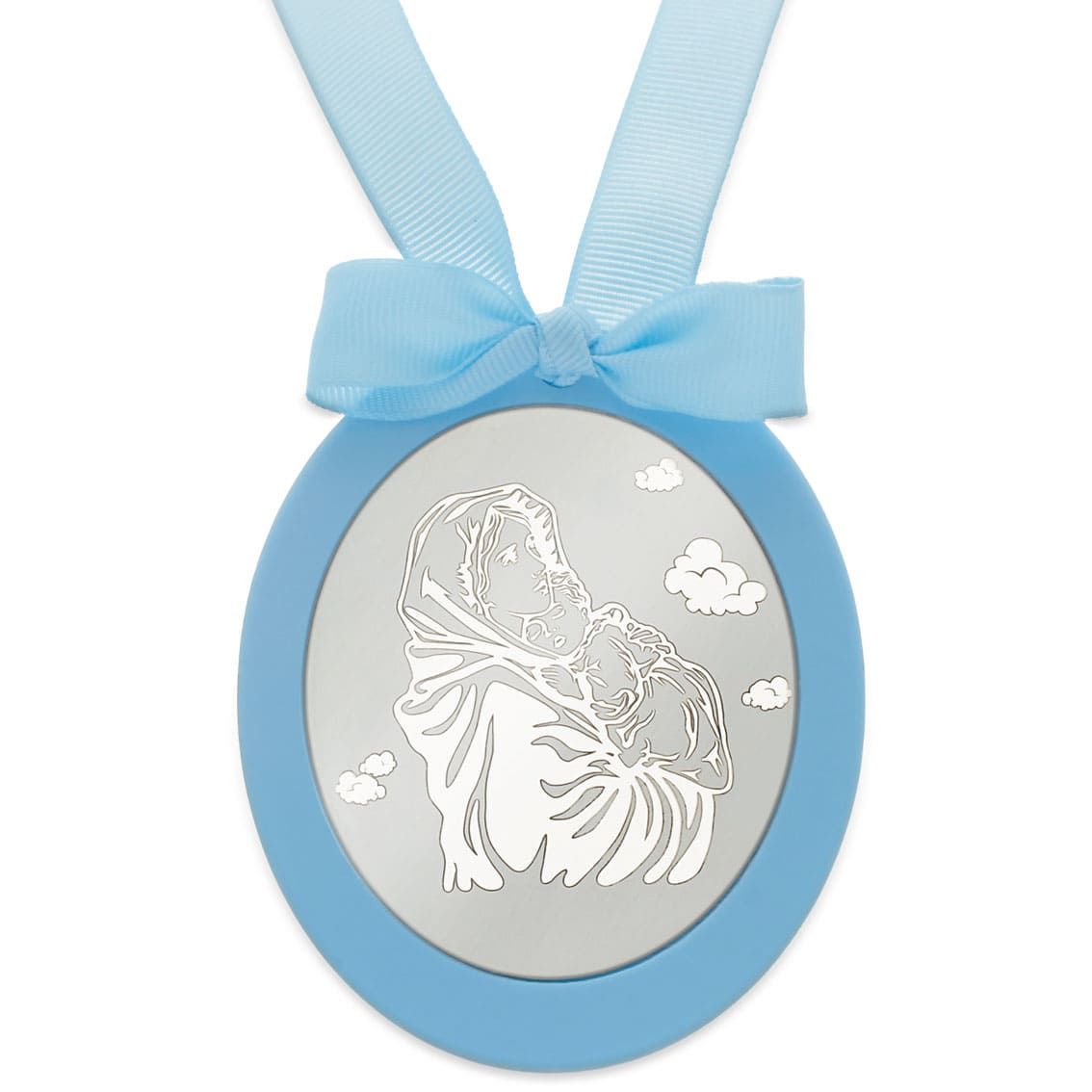 Medalla de Cuna con Chapa Ovalada grabada con la Virgen cogiendo al Niño, en Plata de 1ªLey, 925 mm.