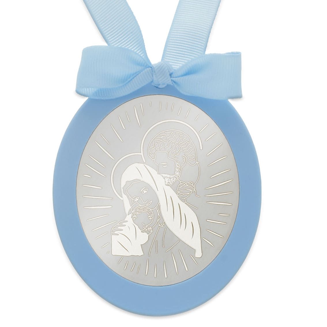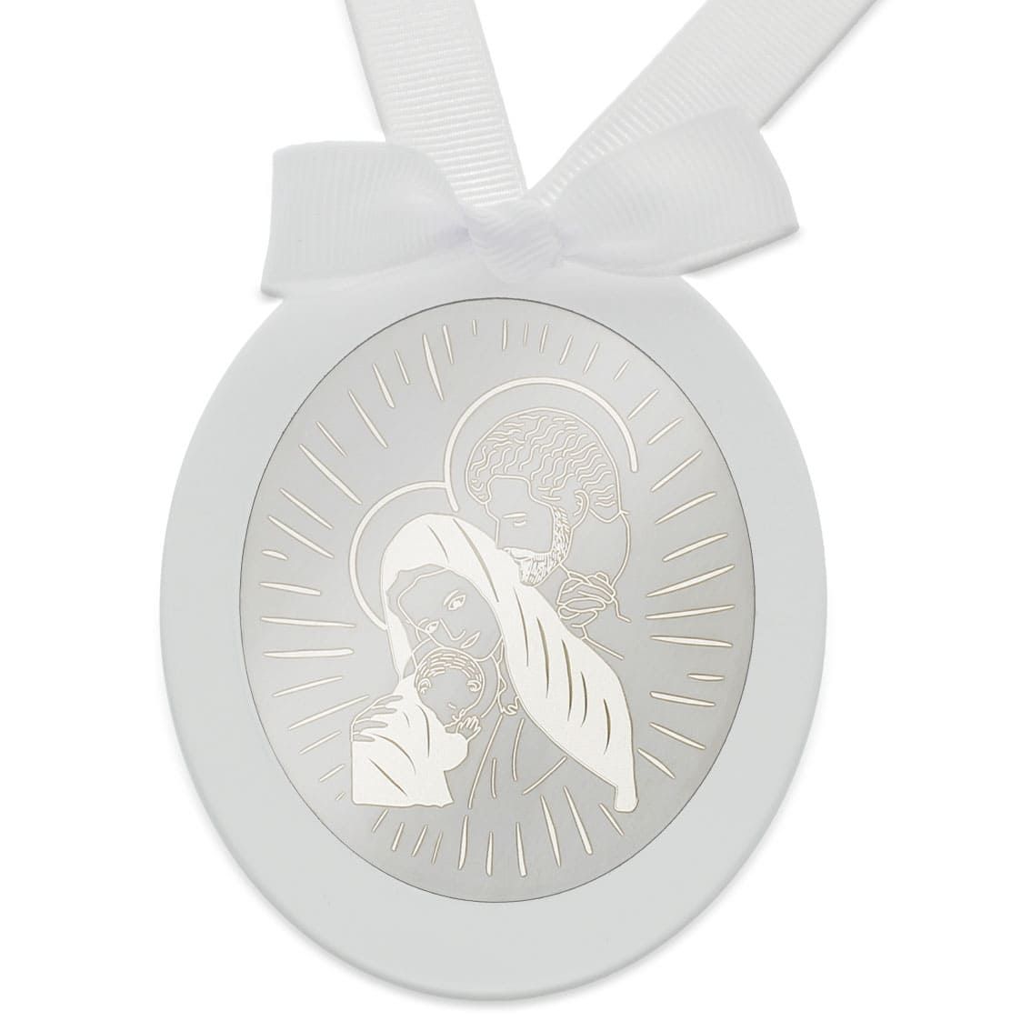 Medalla de Cuna con Chapa Ovalada grabada con la Sagrada Familia, en Plata de 1ªLey, 925 mm.