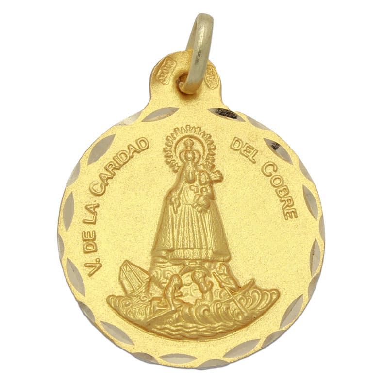 Medalla redonda con el borde tallado en oro de 18kts de la Virgen de la Caridad del Cobre (Cuba) y un diámetro de 21 mm.