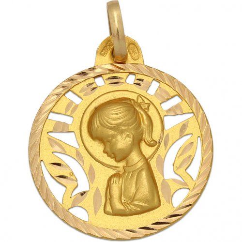 Medalla redonda y calada con el borde tallado en oro de 18kts de la Virgen niña y un diámetro de 22 mm.