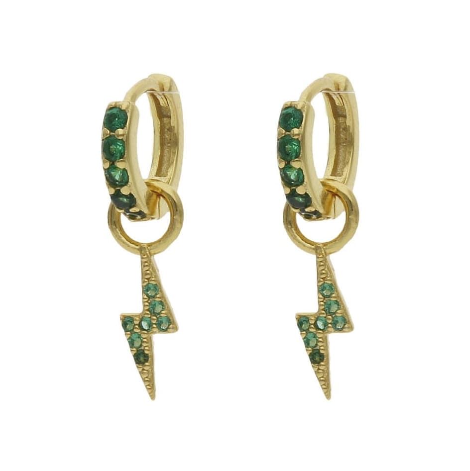 Con baño de oro y abalorios en forma de Rayo, con circonitas engastadas también en tono verde Esmeralda.