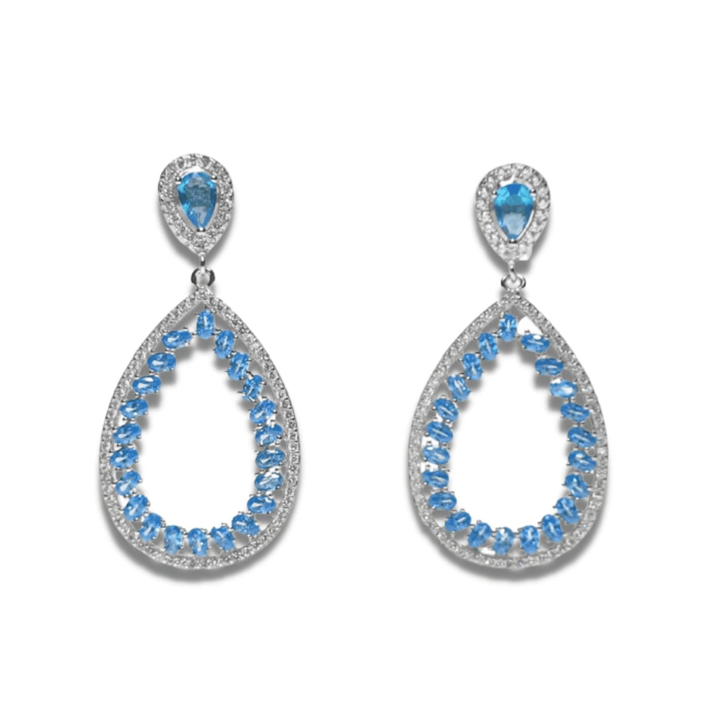 Con baño de rodio, circonitas engastadas combinadas con circonitas de color en tonos aguamarina, además añadir que llevan cierre a presión.