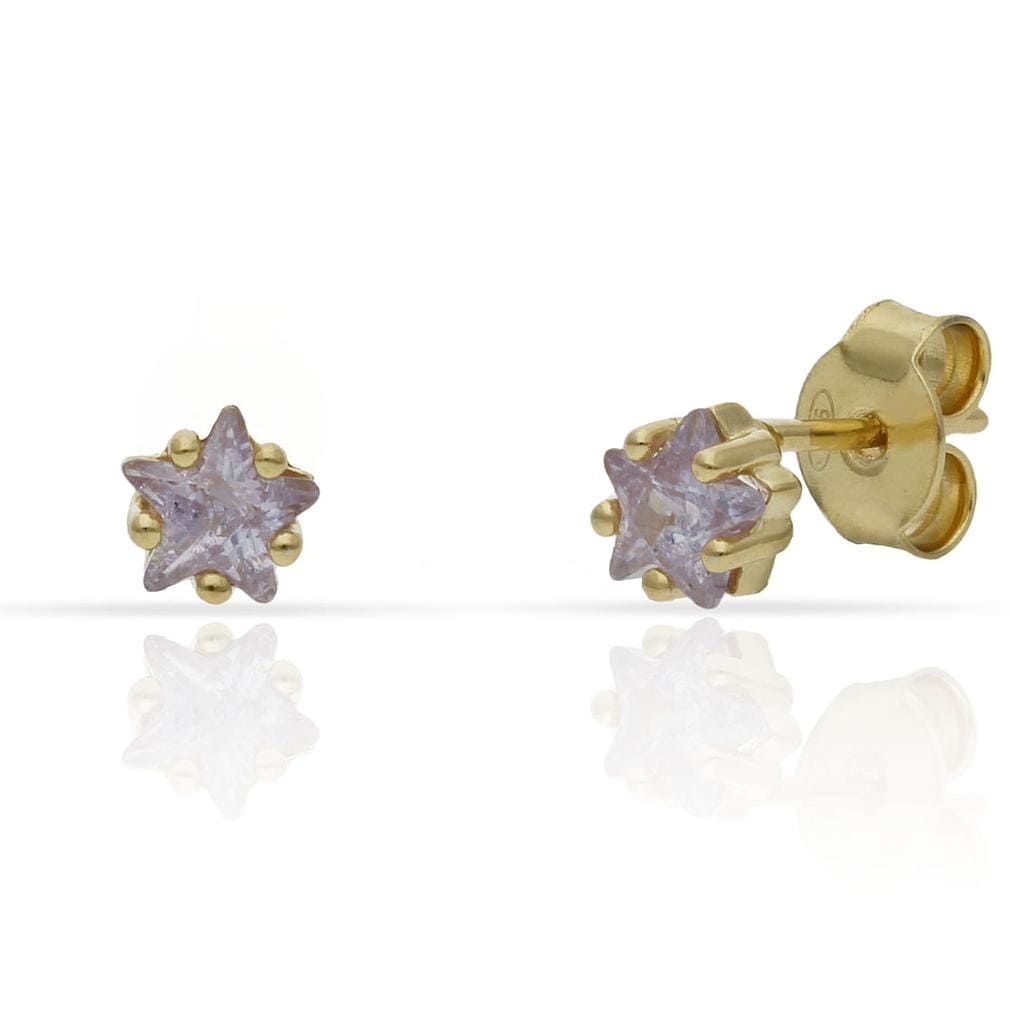 Con baño de oro, circonitas en forma de estrella en color lila y cierre a presión.