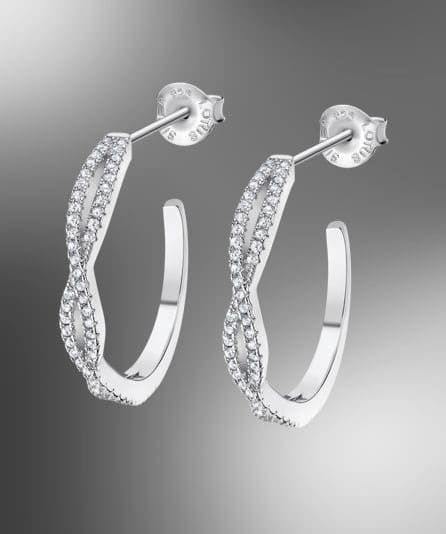 Con baño de rodio, circonitas engastadas, cierre a presión y un diámetro de 1,70 cm.