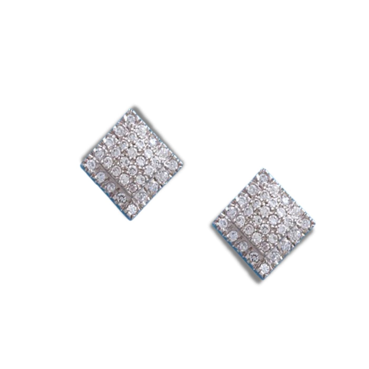 En forma cuadrada con circonitas, cierre a presión y medida: 12 x 12 mm.