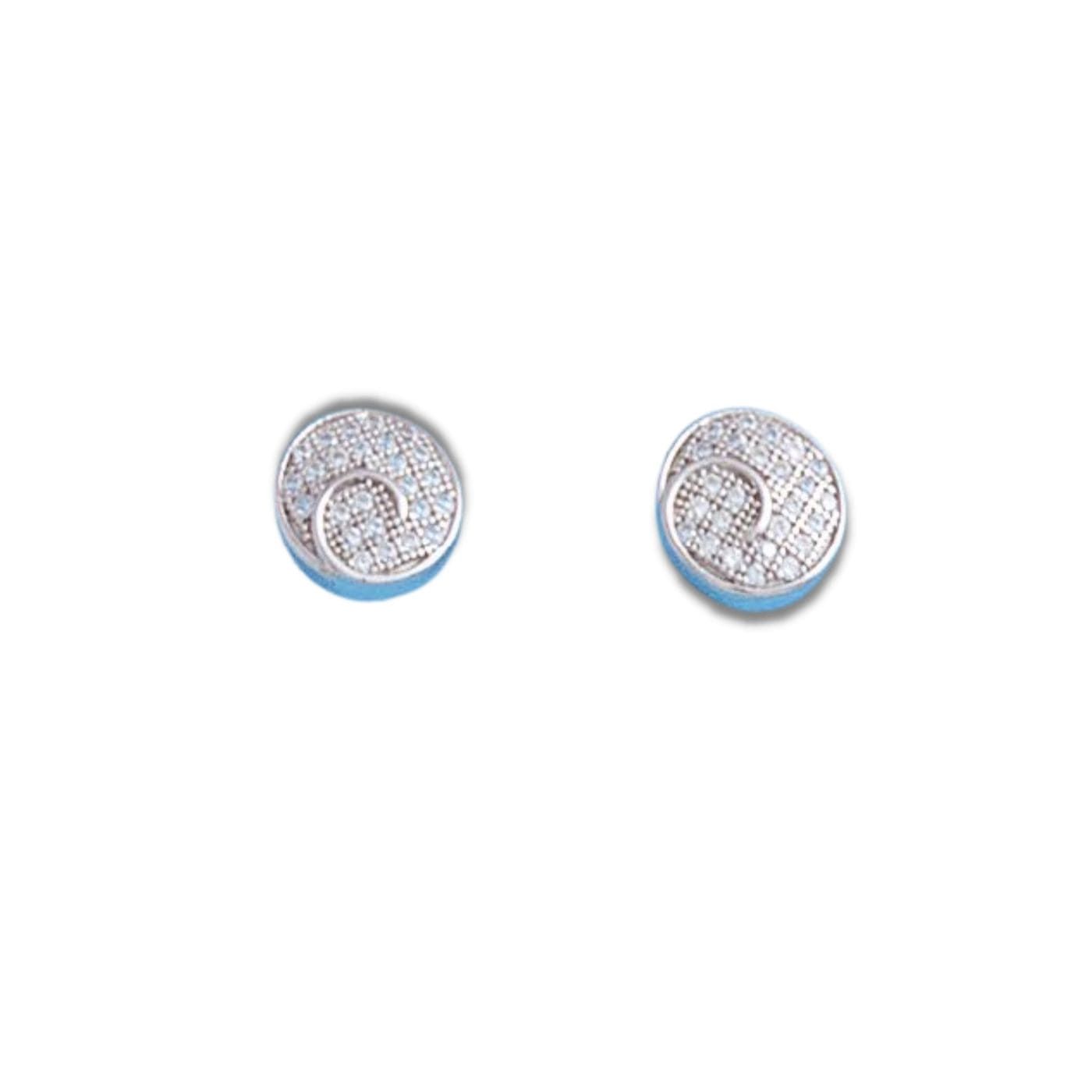En forma redonda con circonitas, cierre a presión y medida: 9 mm.