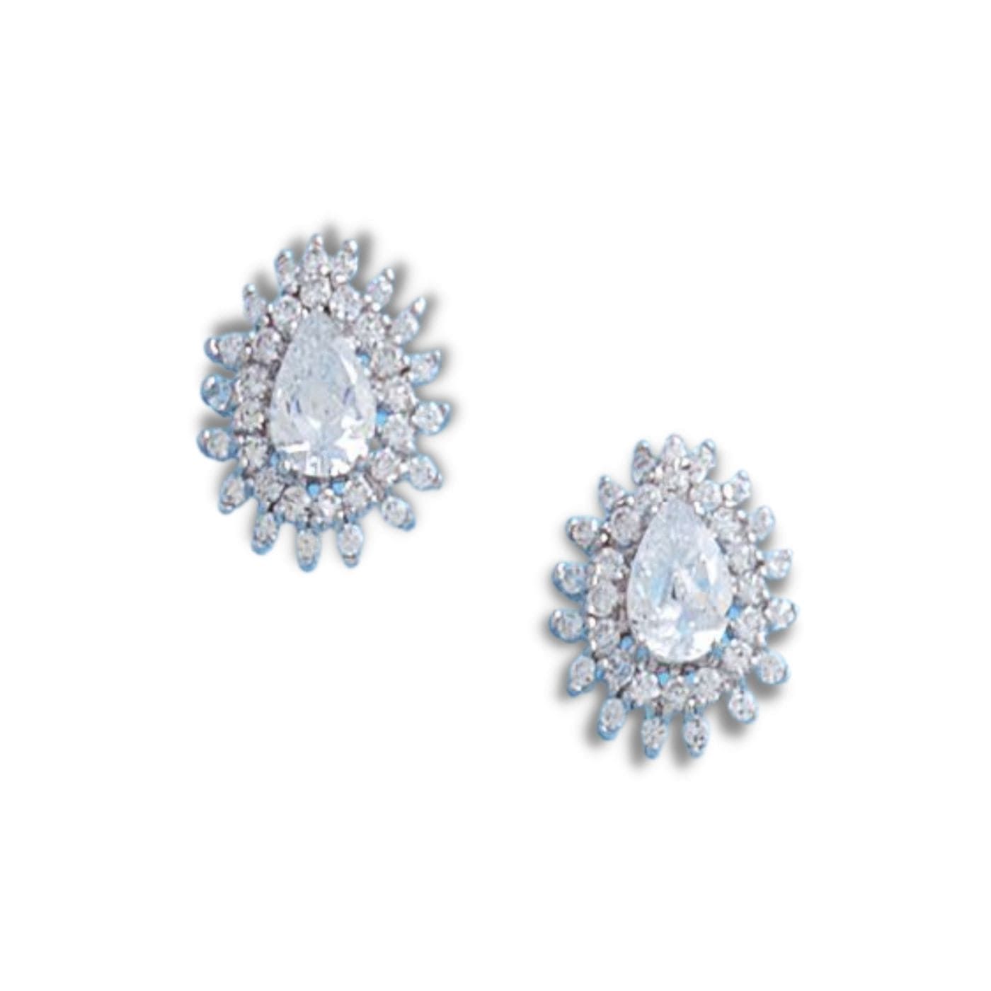 En forma de lágrima con circonitas, cierre a presión y medidas: 12 x 15 mm.