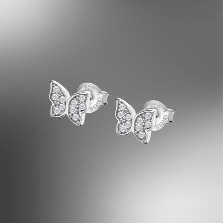 En forma de Mariposa, con circonitas engastadas, cierre a presión  y baño de rodio.