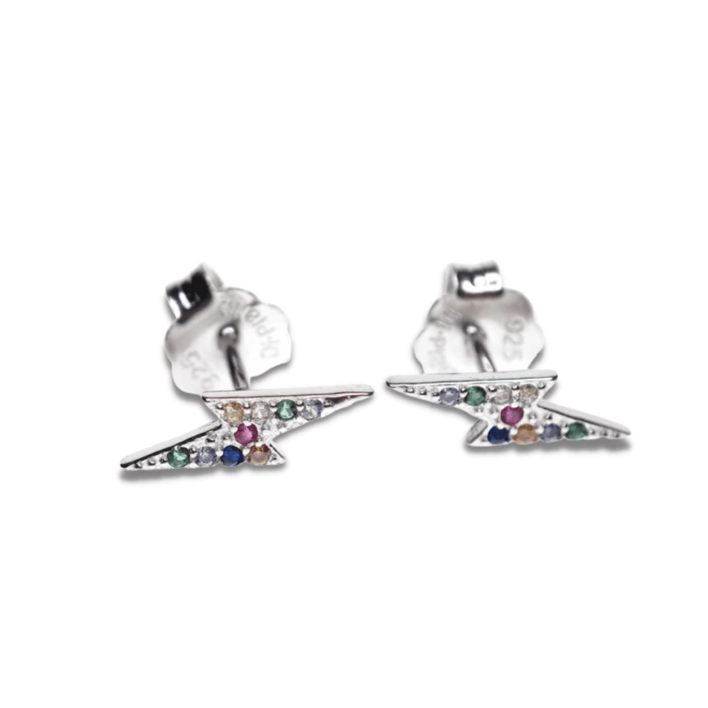 Con baño de rodio y forma de rayo con circonitas de color, además llevan cierre a presión.