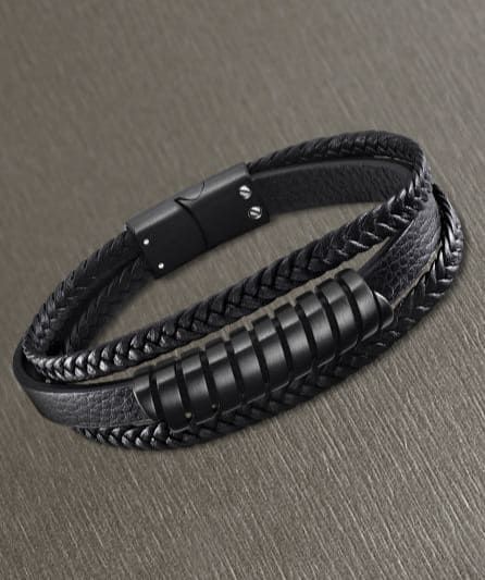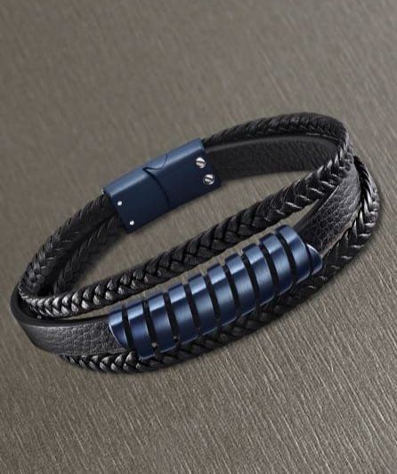 Pulsera de Triple correa de Cuero Negro, trenzada y combinada en cierre y motivo central de acero en ip azul.