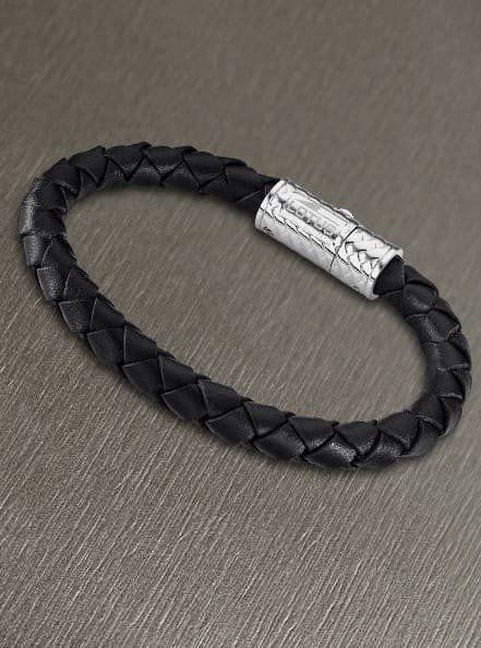 Pulsera Trenzada de Cuero Negro, con cierre de Acero Tallado.