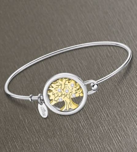 Pulsera Rígida de Acero, con motivo central del Árbol de la Vida chapado en oro y circonitas engastadas.