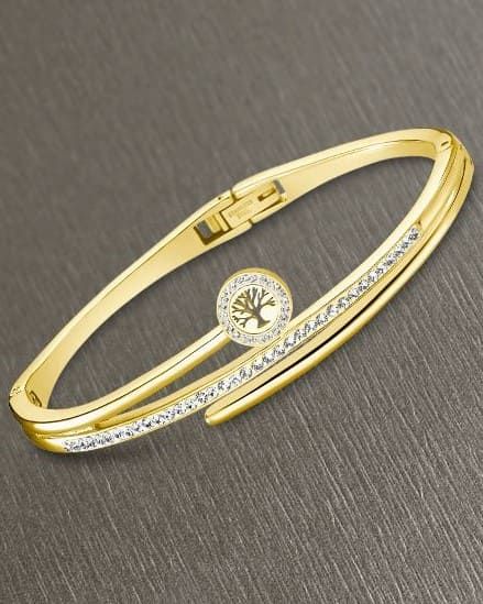 Pulsera Rígida de Acero chapado en oro, con circonitas engastadas y motivo centraldel Árbol de la Vida.
