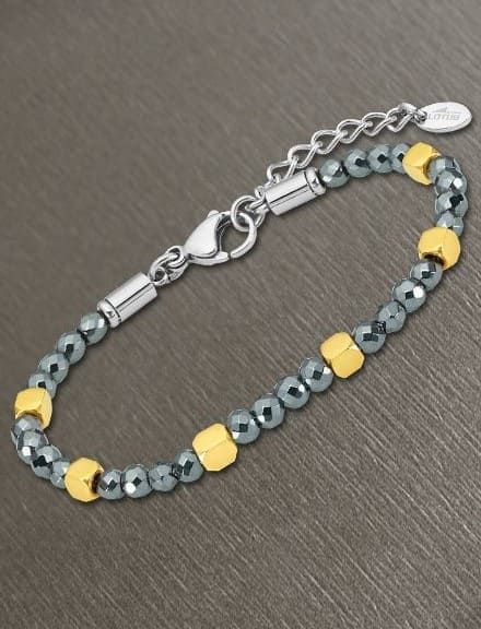 Pulsera de Acero, con bolas y cubos diamantados chapados en oro.