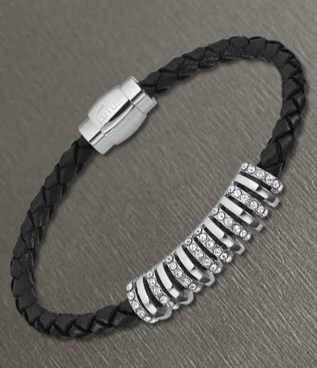 Pulsera Trenzada, en Cuero Negro, con motivo central y cierre en Acero.