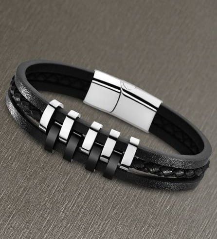 Pulsera Trenzada de Cuero Negro, con cierre y motivos de Acero combinados en ip negro.