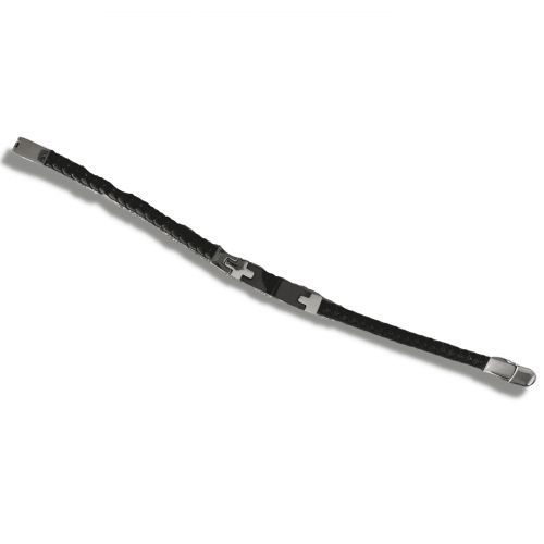 Pulsera de cuero negro trenzado y acero combinado en ip negro.