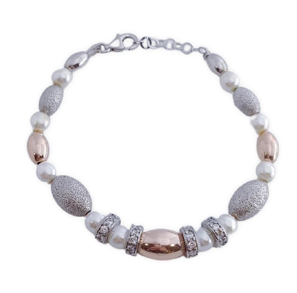 Pulsera con perlas chinas, circonitas y abalorios de rodio rosa, en plata de 1ª ley, 925 mm.