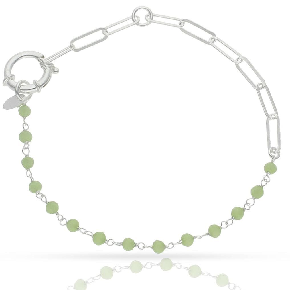 Pulsera de eslabones alargados combinados con hilera de bolas de piedra verde, con un diámetro de 3 mm, en plata de 1ª ley, 925 mm.