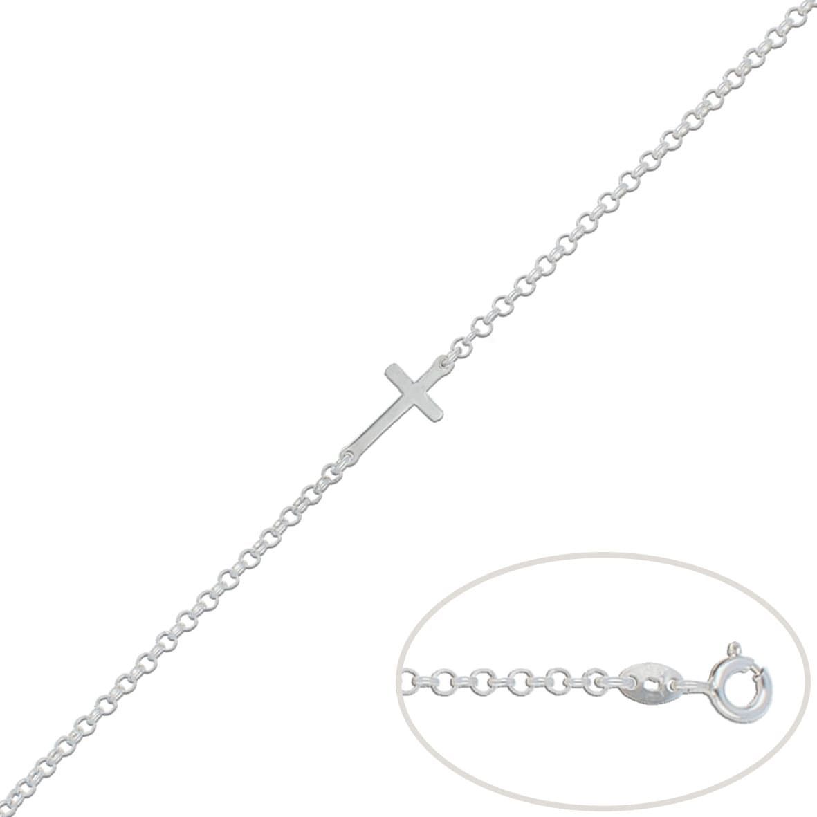 Con motivo de cruz en ella unida por dos extremos hasta el cierre por una cadena rolot con un ancho de 2 mm y un largo de 18,50 cm.