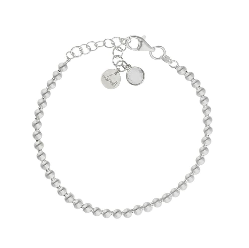 Con bolitas de 4 mm de diámetro, circonita en color lila en el terminal, disponible en diferentes colores de piedra, además tiene un largo de 20,50 cm disponible para colocar en un largo mínimo de 17 cm.