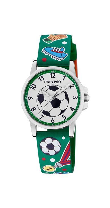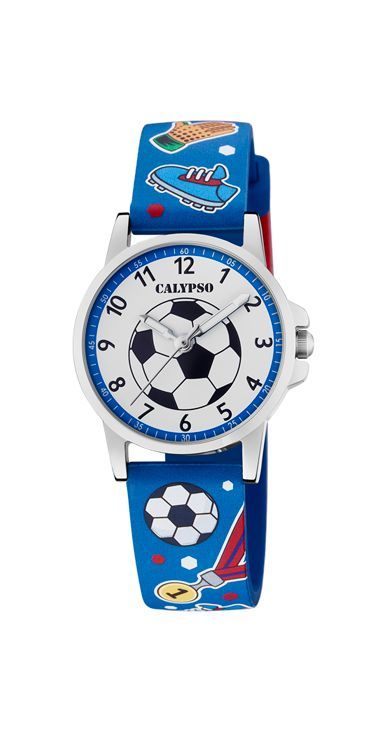 Reloj Calypso Futbolero, analógico de cuarzo, para niños, con dibujos de deportes, caja de acero y correa de caucho en color azul.