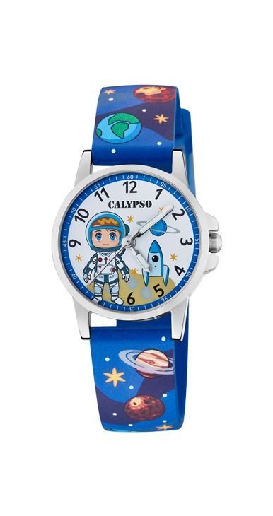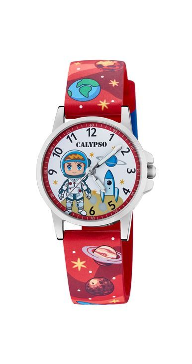 Reloj Calypso Astronauta, analógico de cuarzo, para niños, con dibujos de la galaxia, caja de acero y correa de caucho en color rojo.