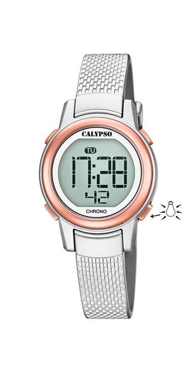 Reloj Calypso digital plateado con caja de plástico de 29 mm de diámetro, esfera en color oro rosa y correa de caucho con 12 mm de ancho.