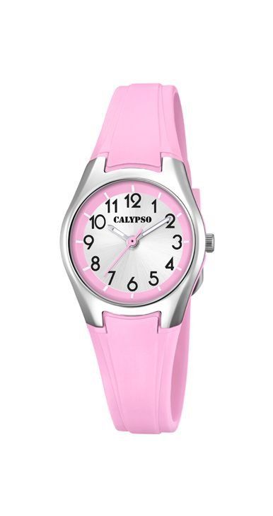 Reloj Calypso analógico en color rosa chicle con esfera blanca de números negros.