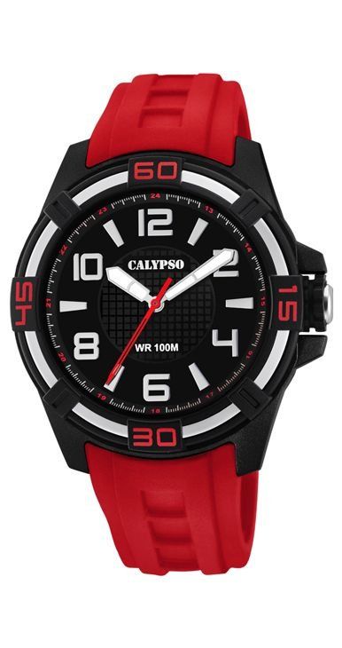 Reloj Calypso analógico con correa de caucho en color roja de 22 mm de ancho y caja de plástico en color negro con esfera negra y números en color blanco, con un diámetro de 51,30 mm.